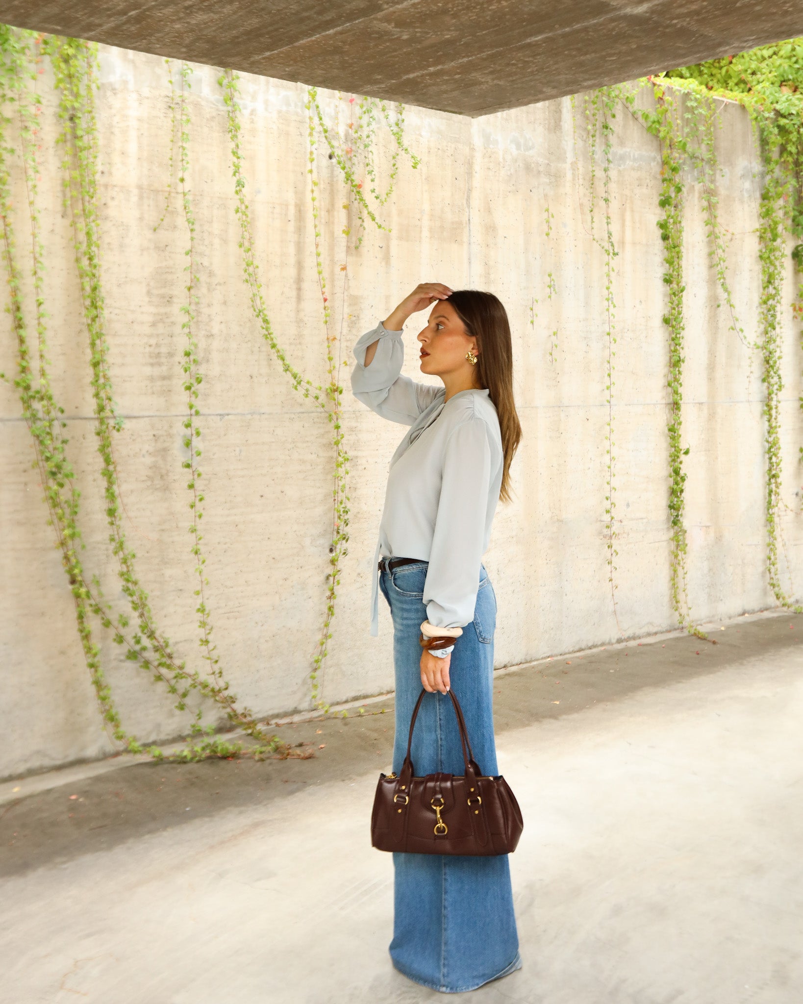 Blusa com decote em V e laço ajustável no decote. Manga comprida com punho abalonado e ombro franzido.