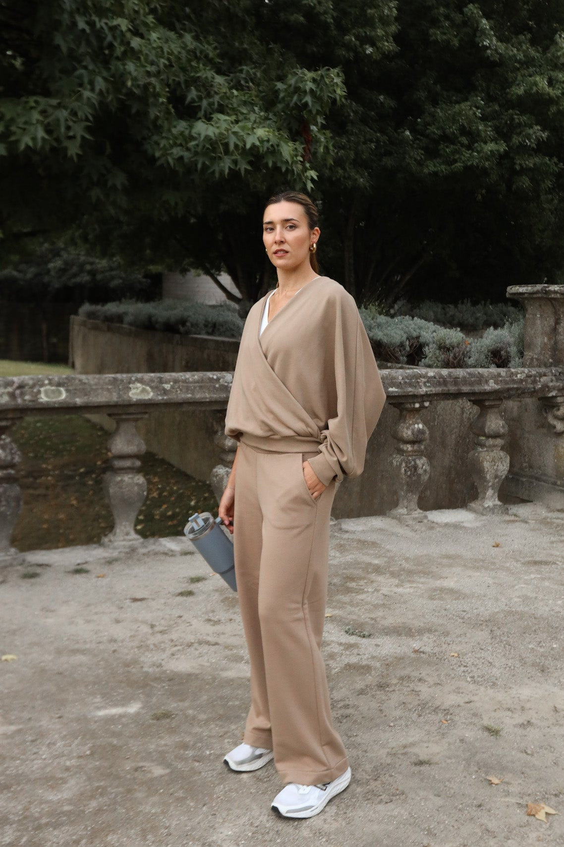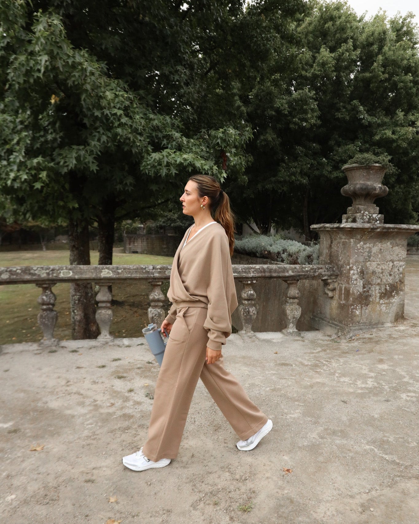 Calça de cintura baixa em malha felpa. Bolsos lateriais inclinados e cinto em rib.