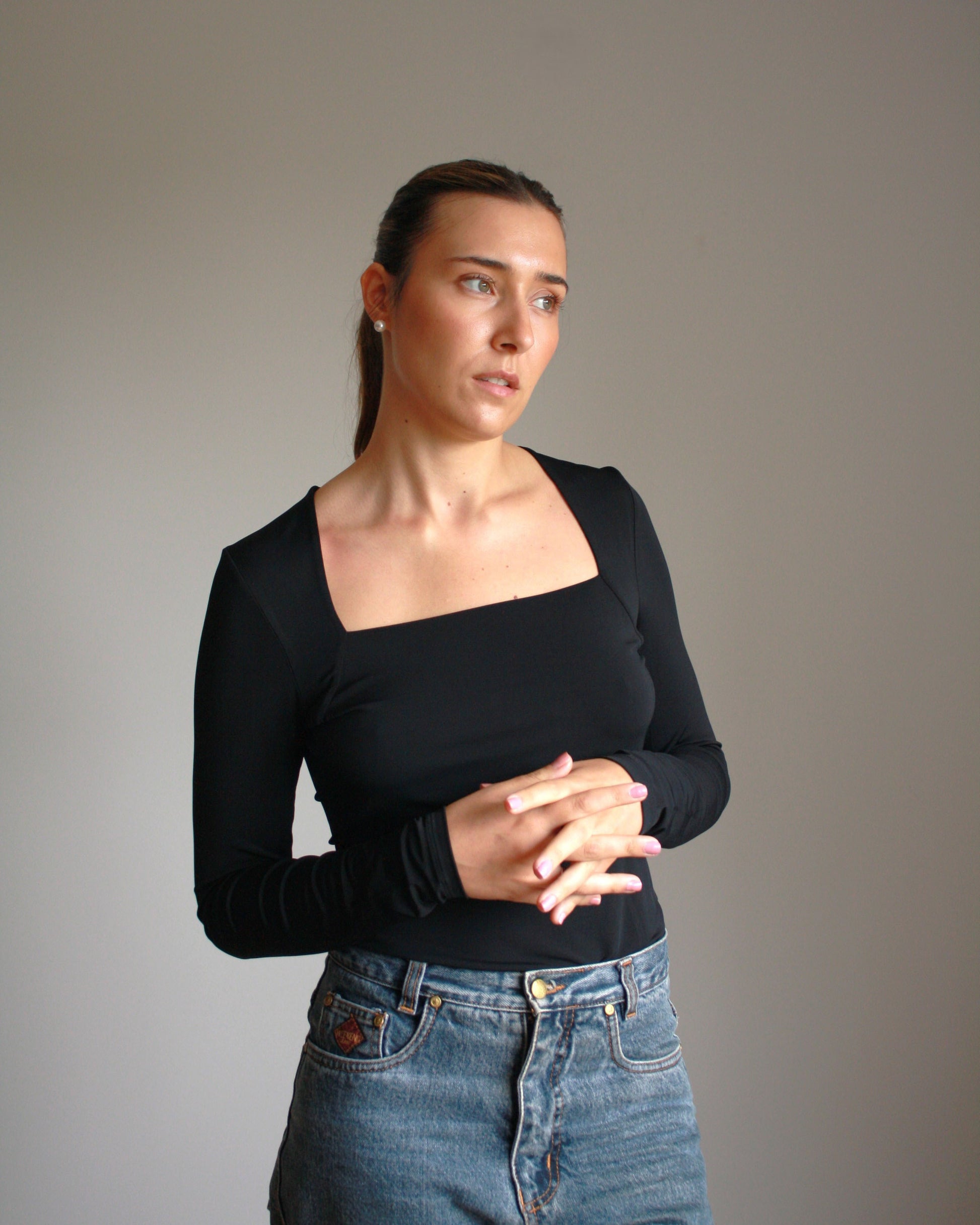 Camisola em poliamida de decote quadrado.