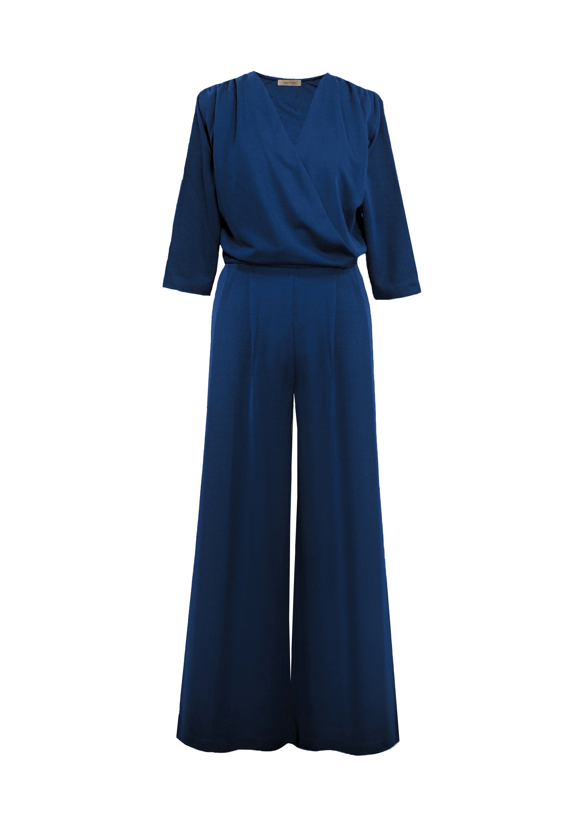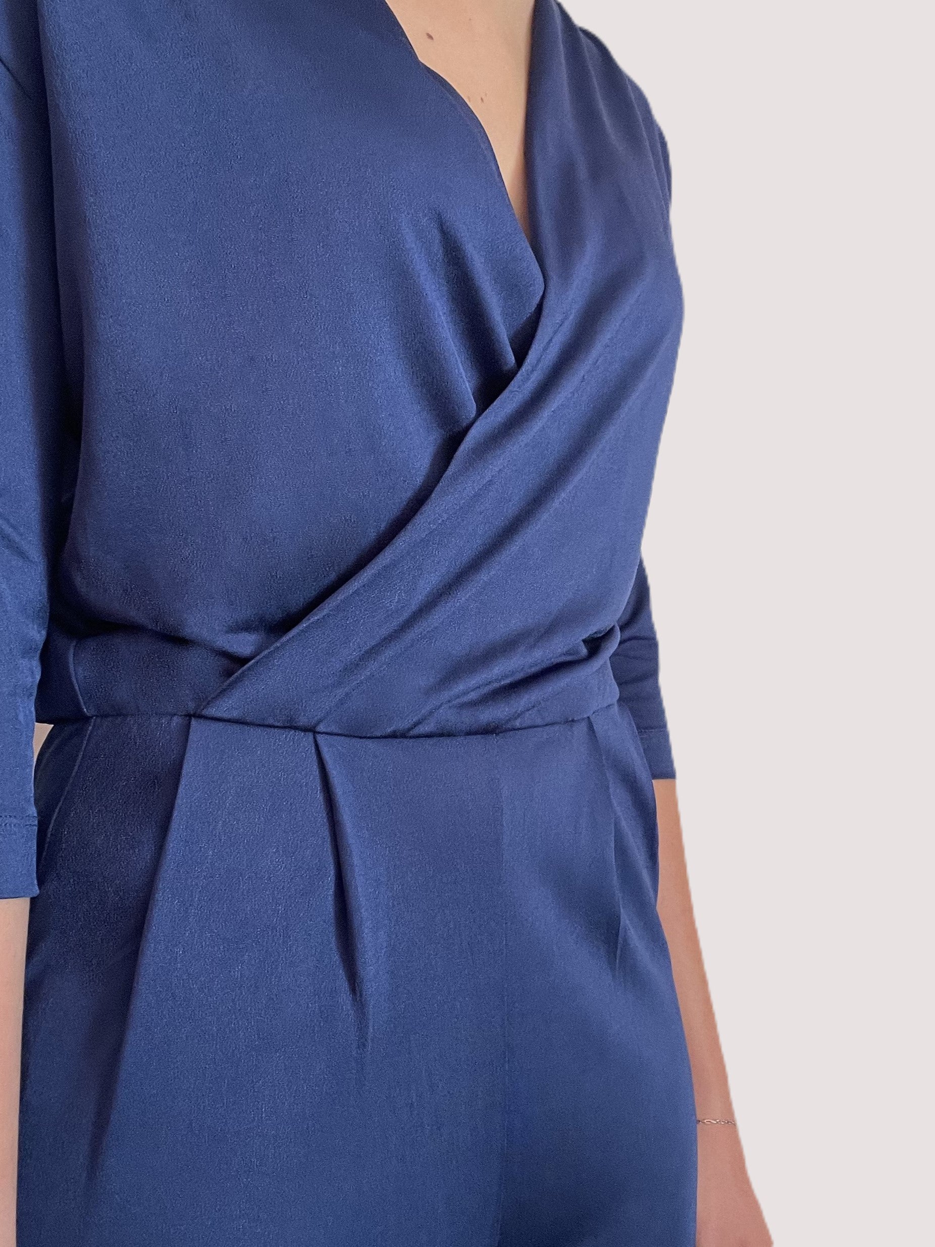 Macacão acetinado com decote trespassado. Perna wide leg e manga 3/4. Ajusta na cintura com elástico.