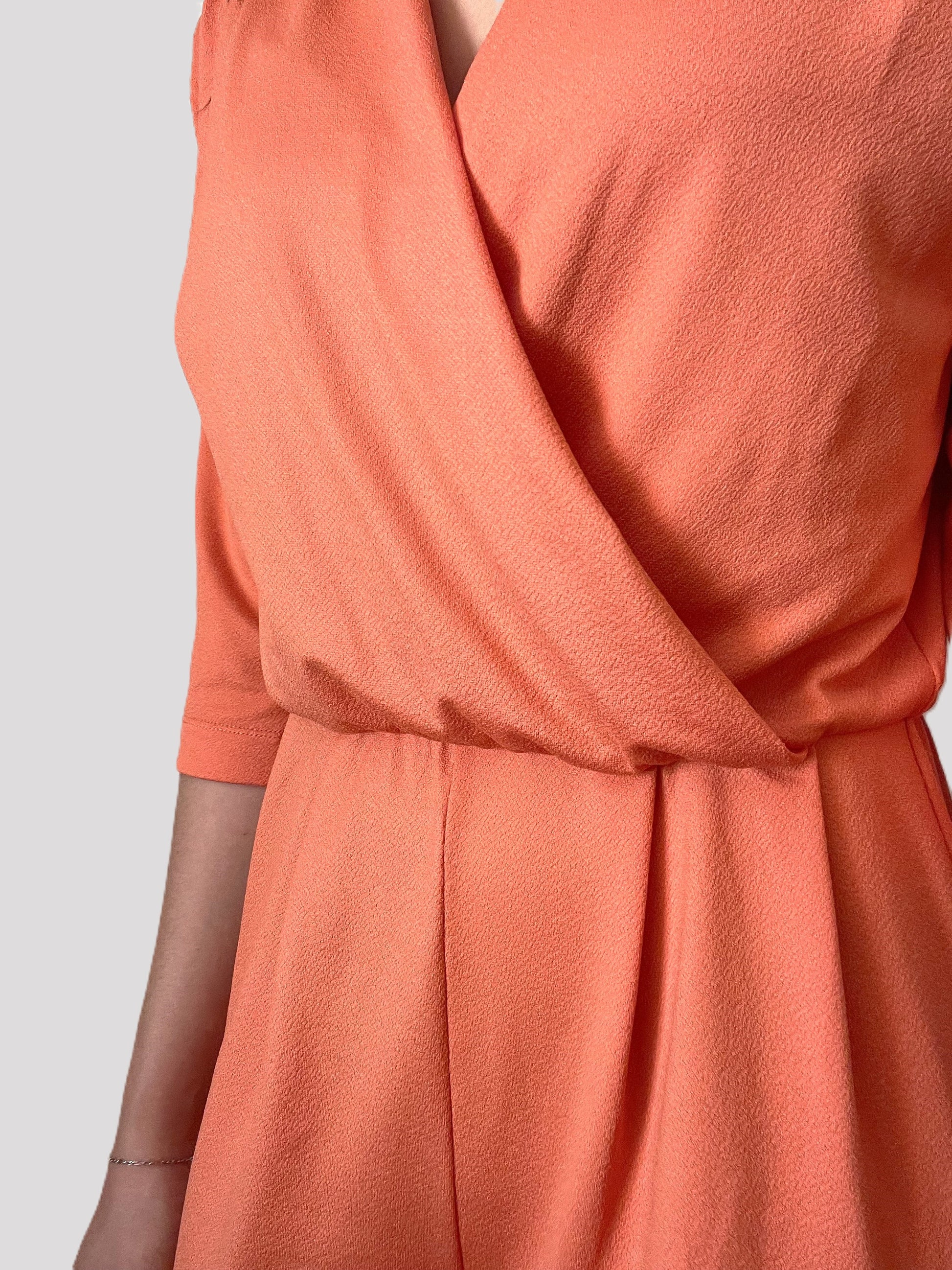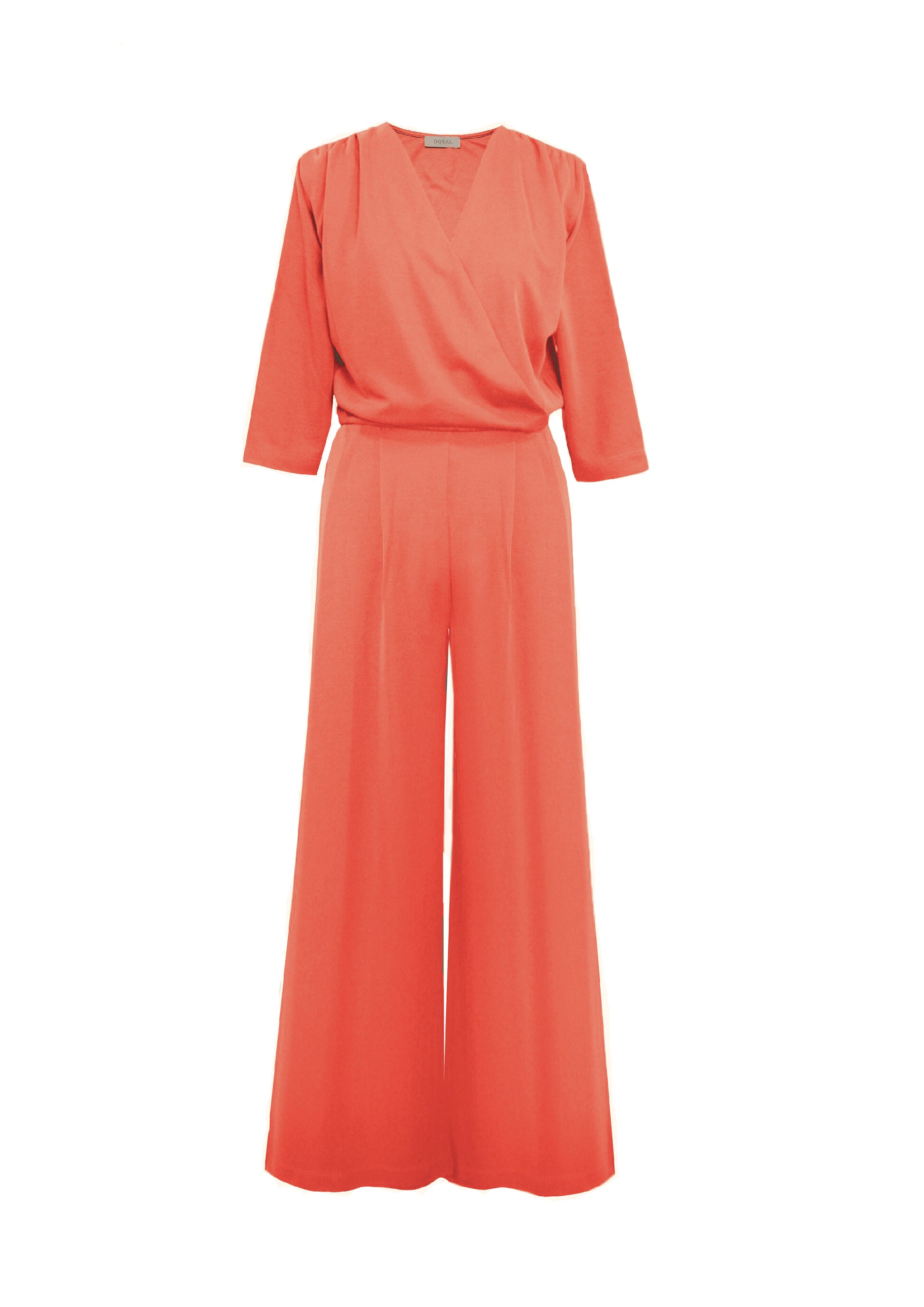 Macacão com decote trespassado, perna wide leg e manga 3/4. Ajusta na cintura com elástico.