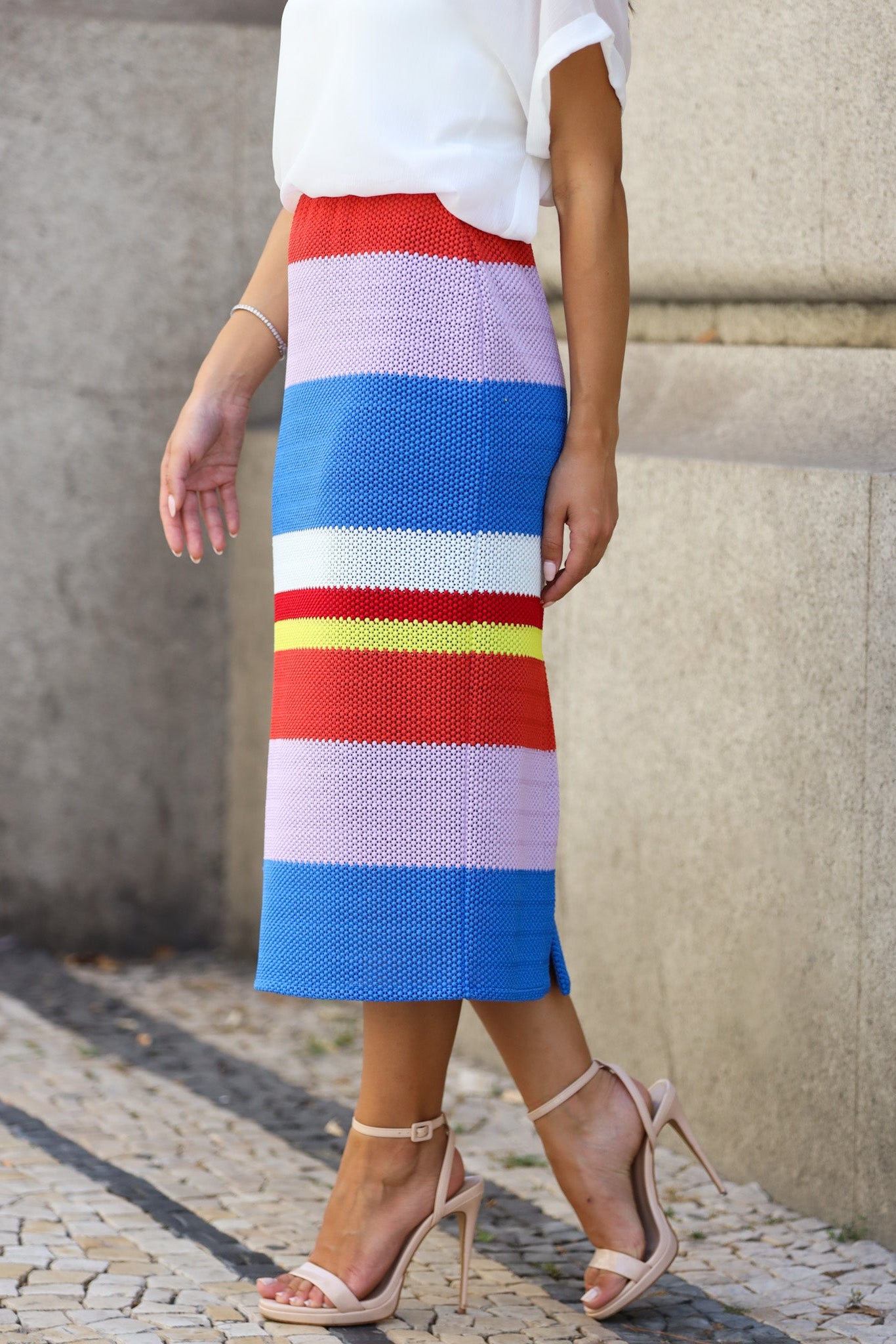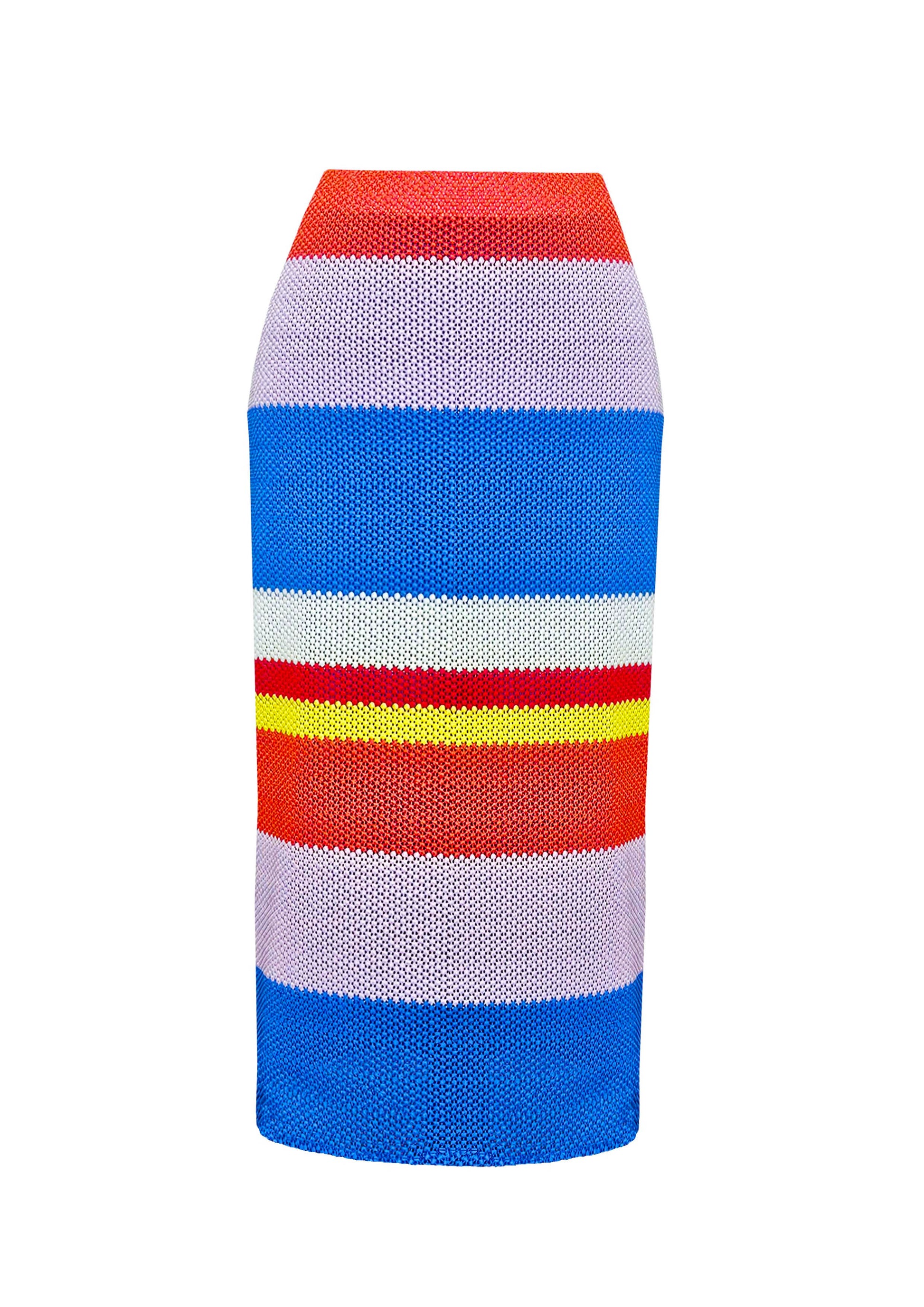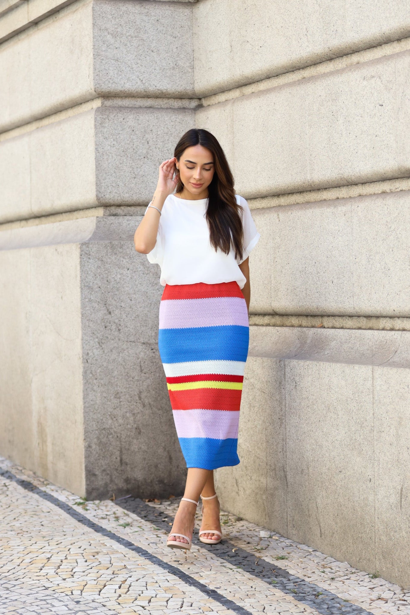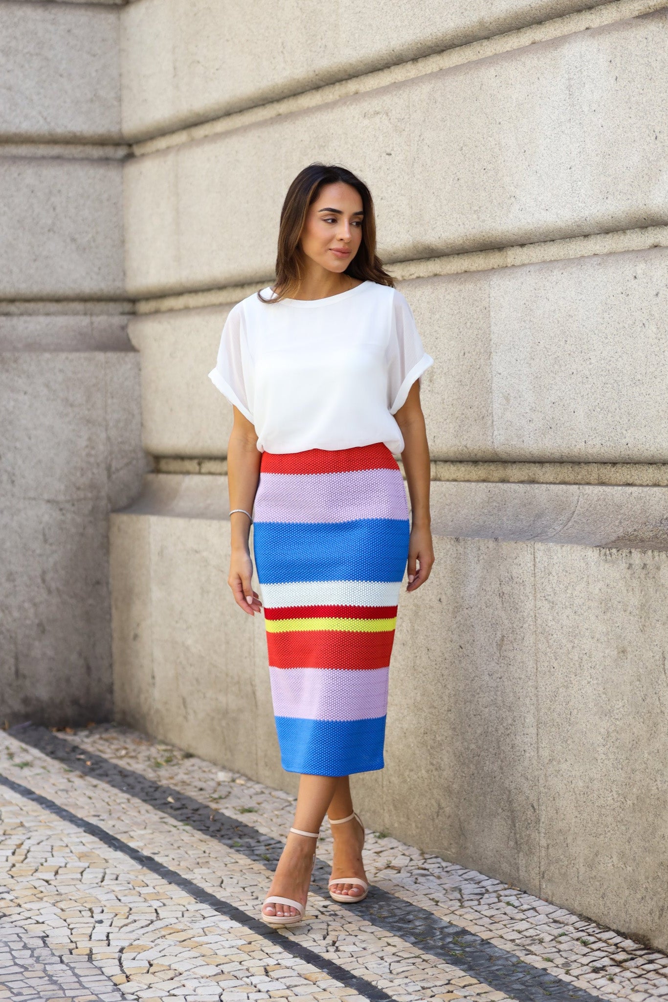 Saia em tecido "crochet" com forro. Peça de corte lápis com elástico interno na cintura.