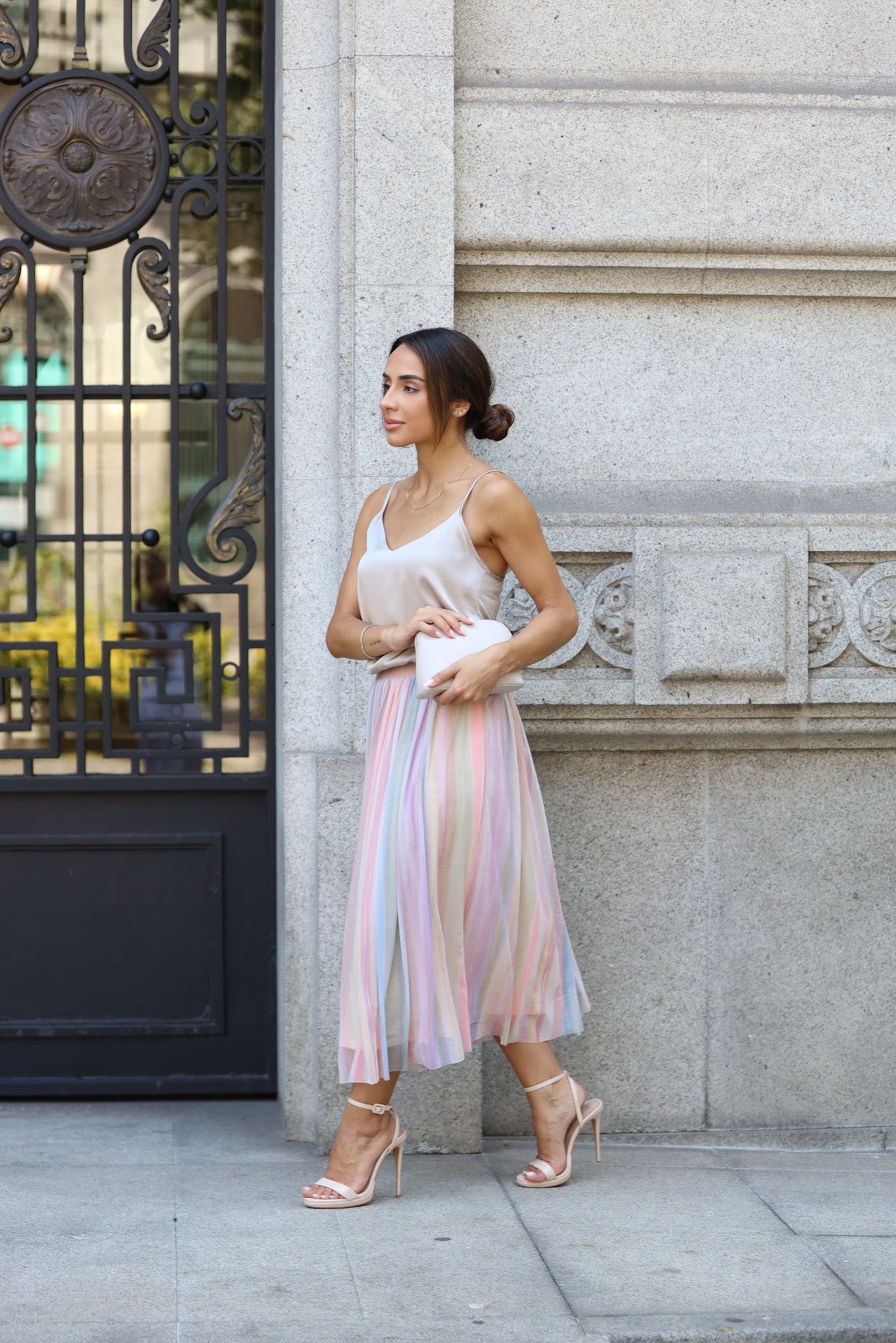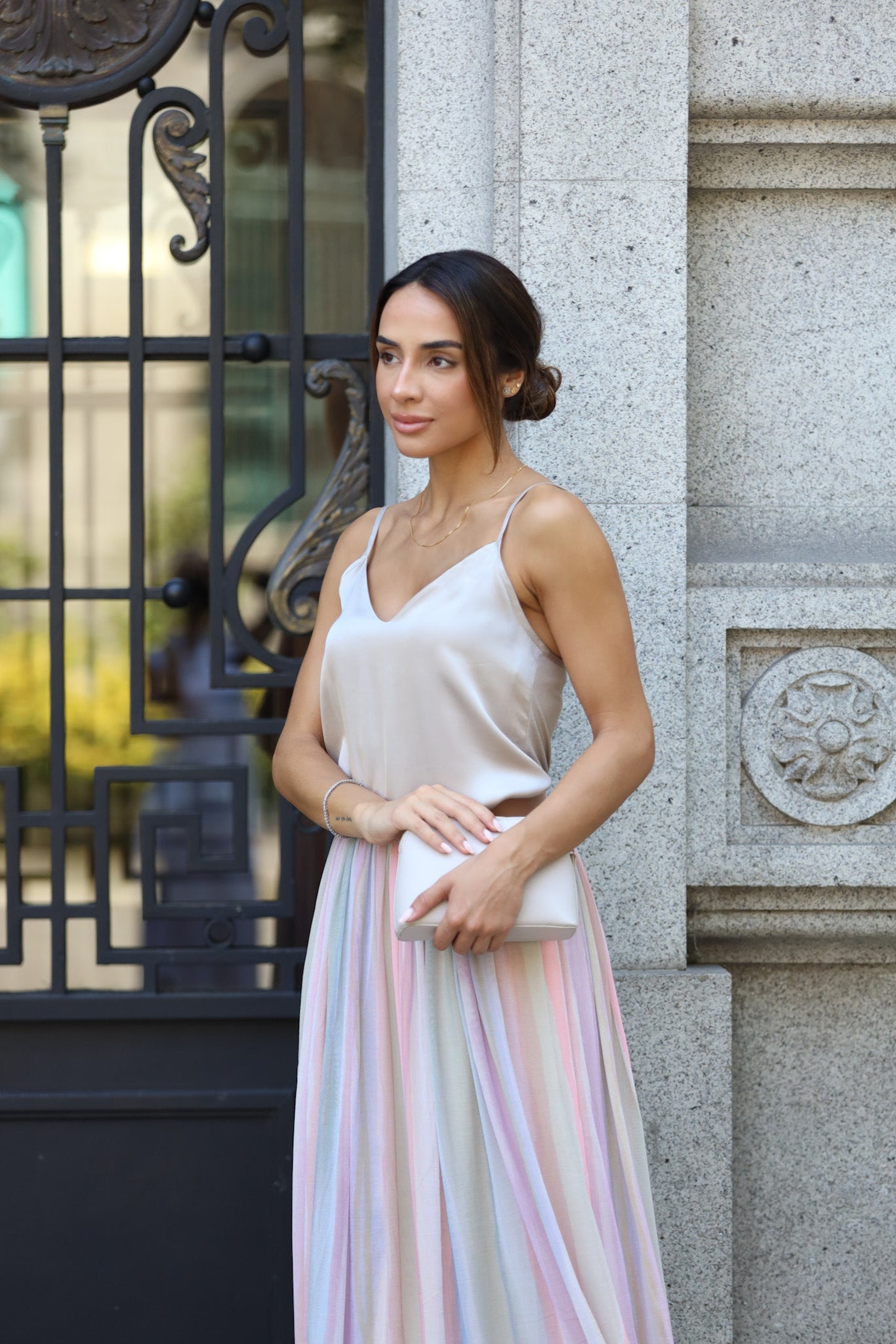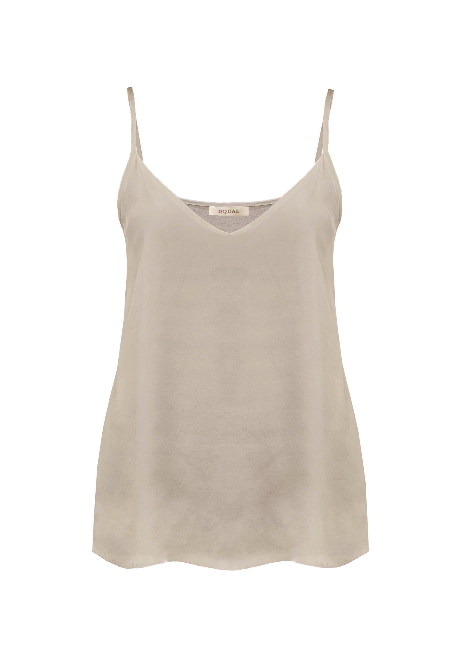 Top de alça fina com frente dupla em cetim e costa em malha.