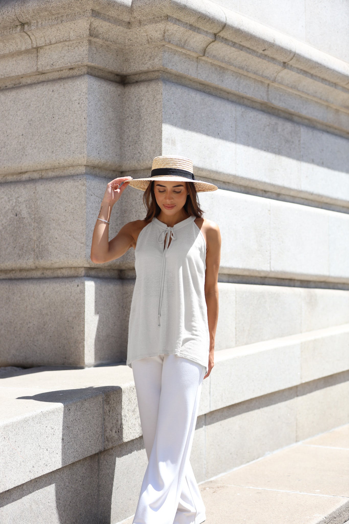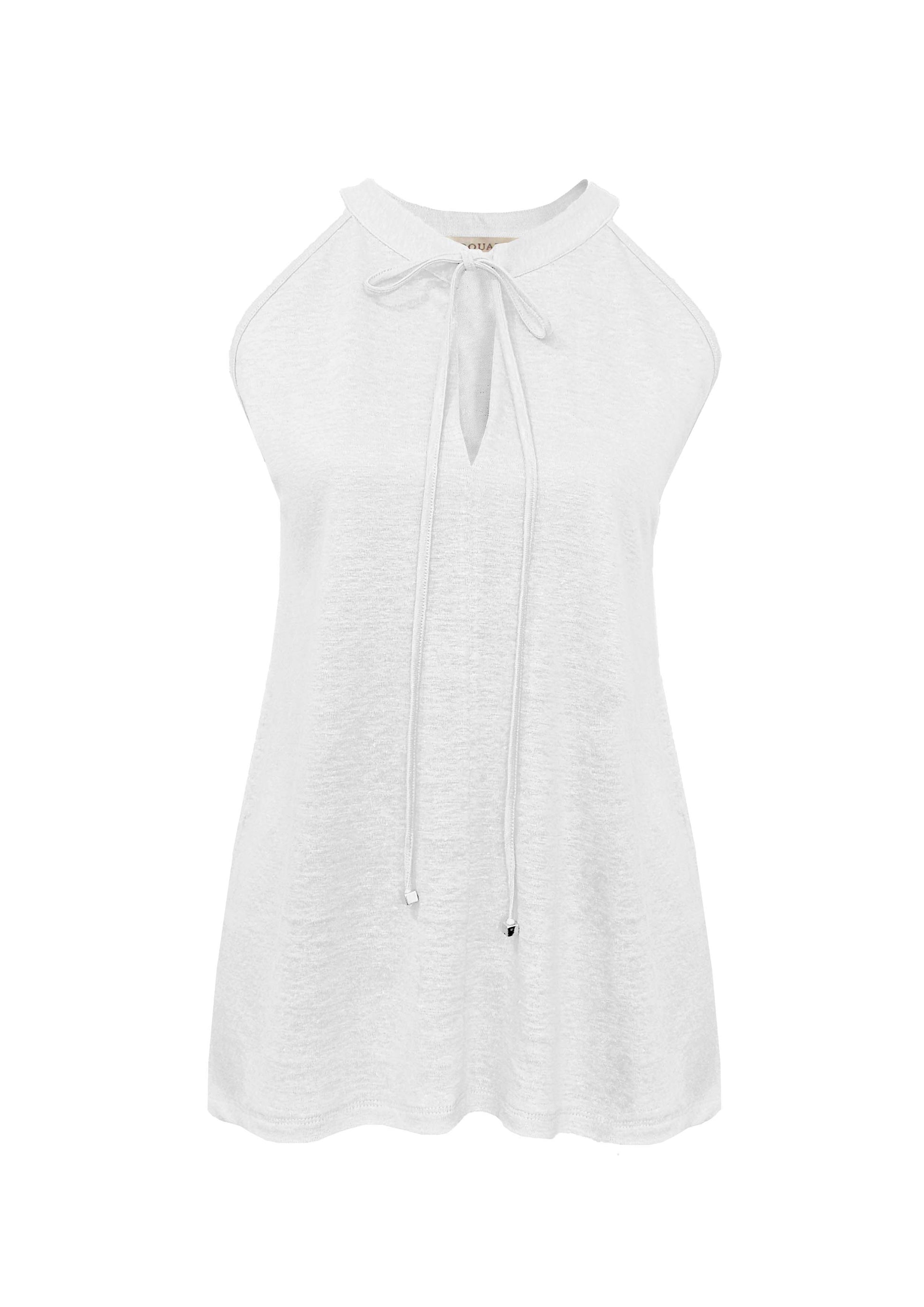 Top halter que ajusta no decote com laço. Top sem mangas e feita em linho Europeu.
