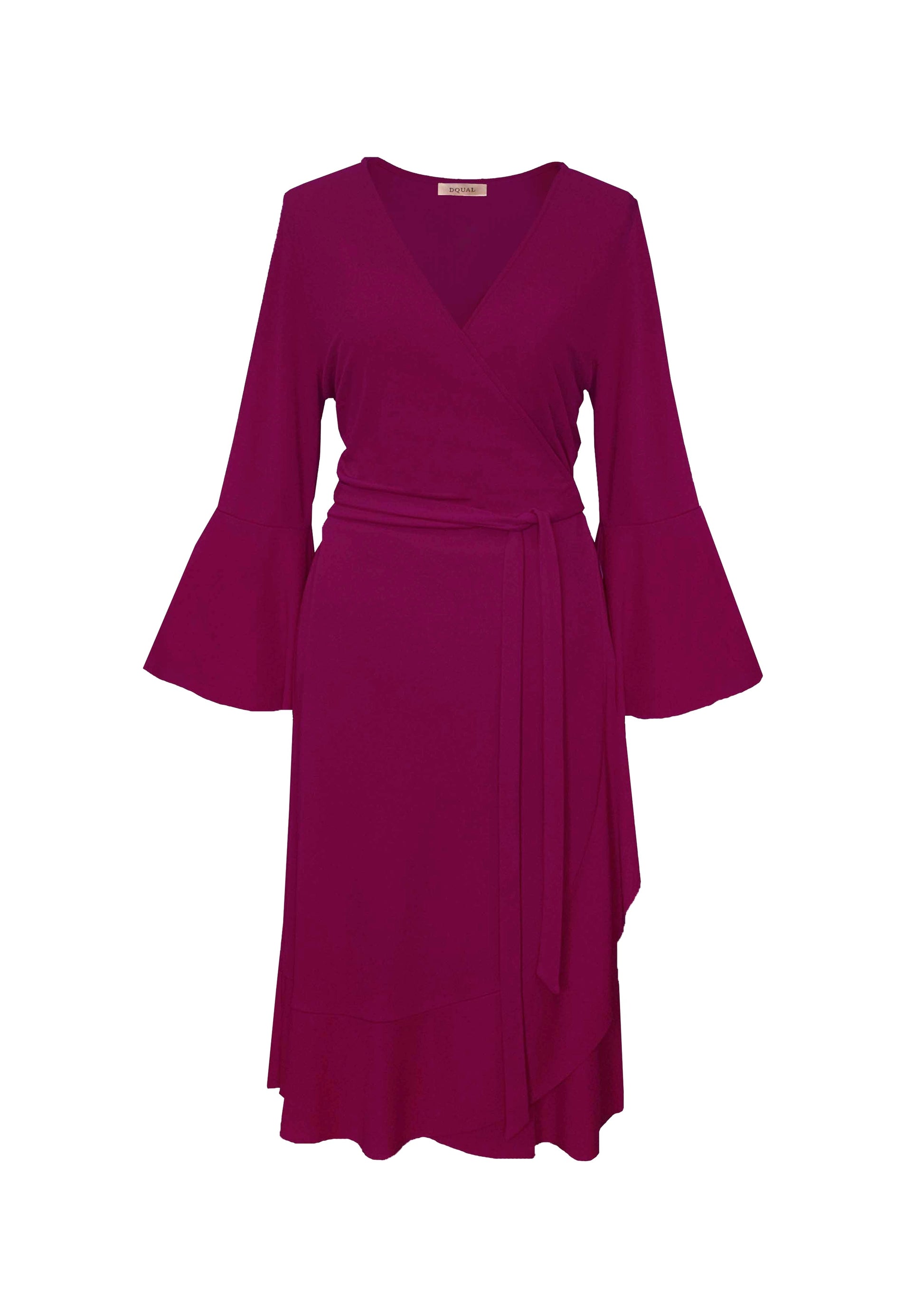 Vestido de trespasse com folho assimétrico, decote em V e punho evasê. Ata com tira lateral.